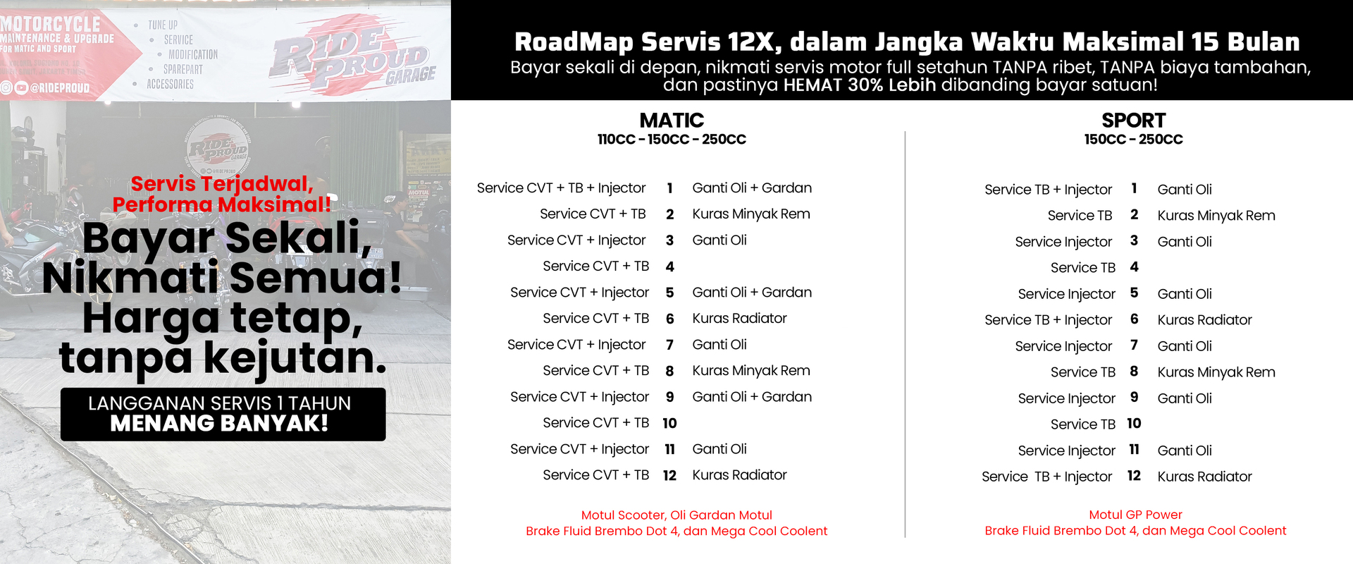 RPM Plan adalah solusi servis berlangganan dari RideProud yang dirancang khusus untuk Anda yang mengandalkan motor setiap harinya. Dengan Roadmap Servis selama 12X dalam jangka waktu maksimal selama 15 Bulan, motor Anda selalu dalam performa terbaik.